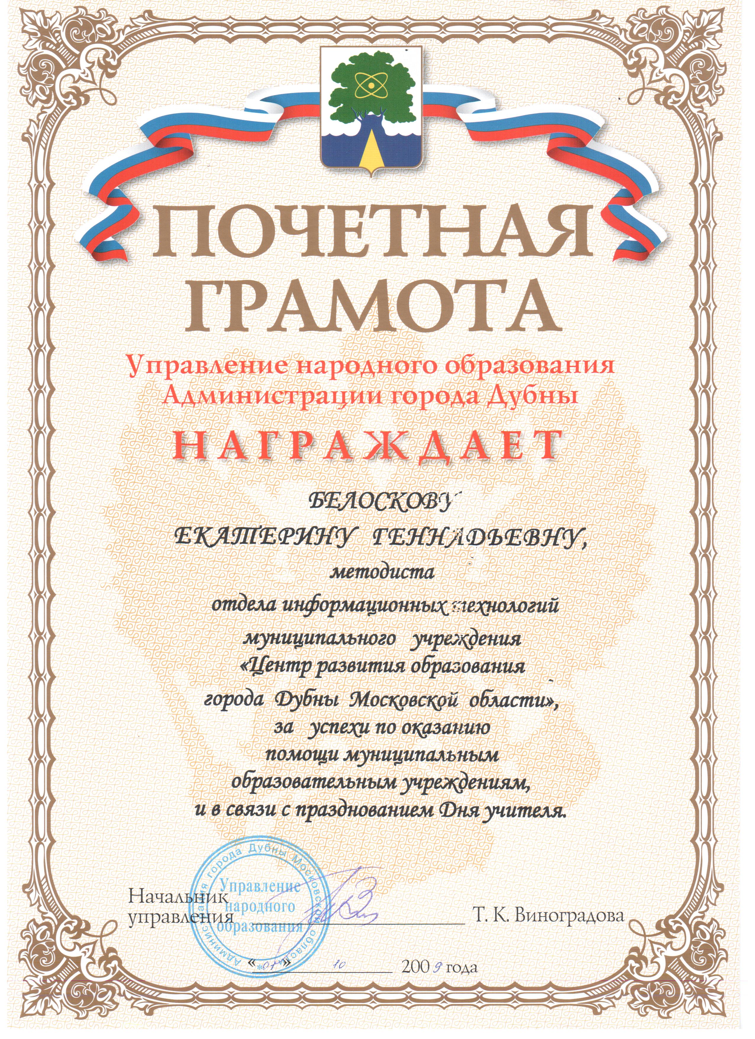 5. Почетная грамота Управления народного образования Администрации города Дубны Московской области, 2009, 2023