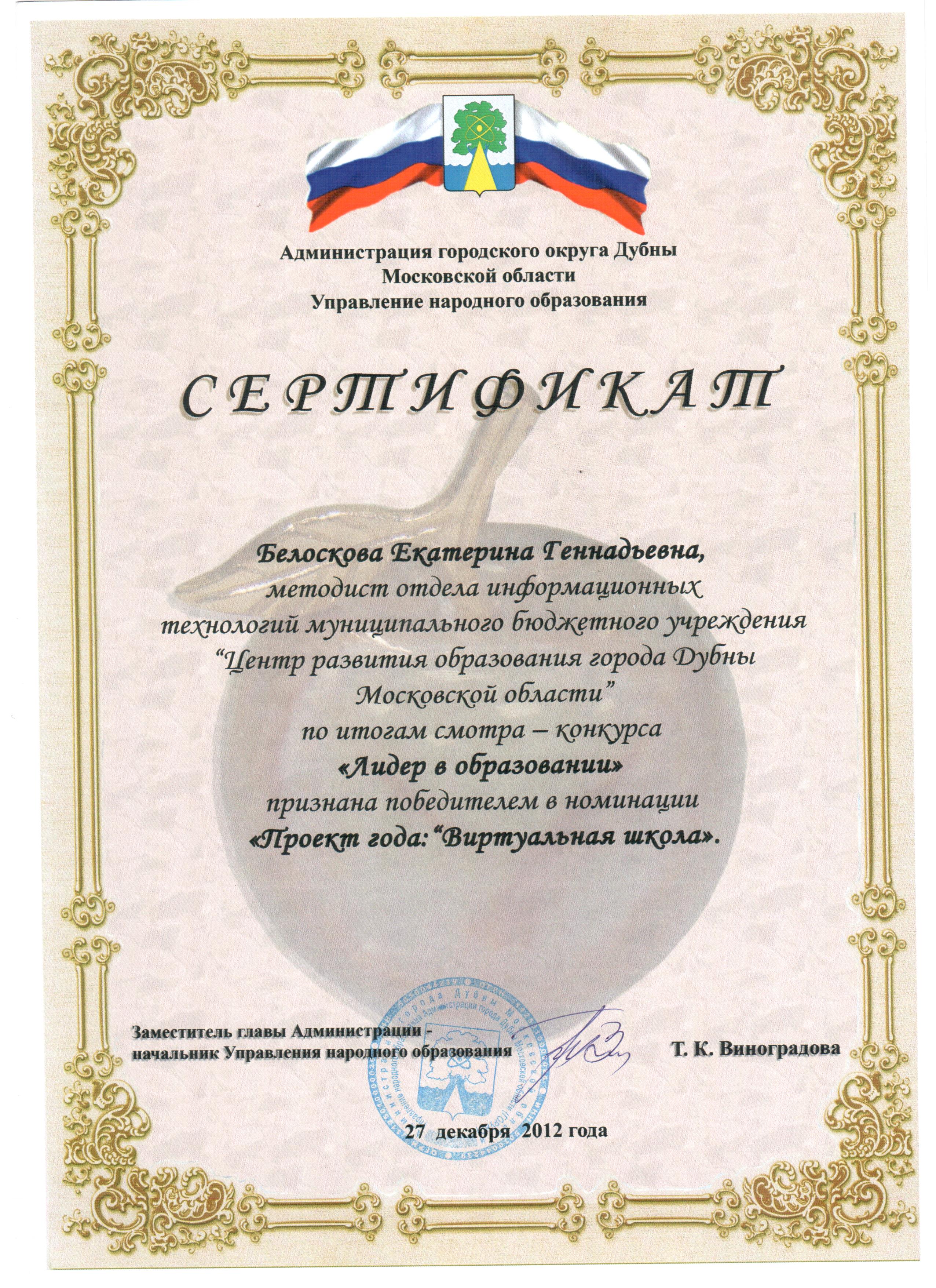 6. Победитель смотра-конкурса «Лидер в образовании» в номинации «Проект года: «Виртуальная школа», 2012