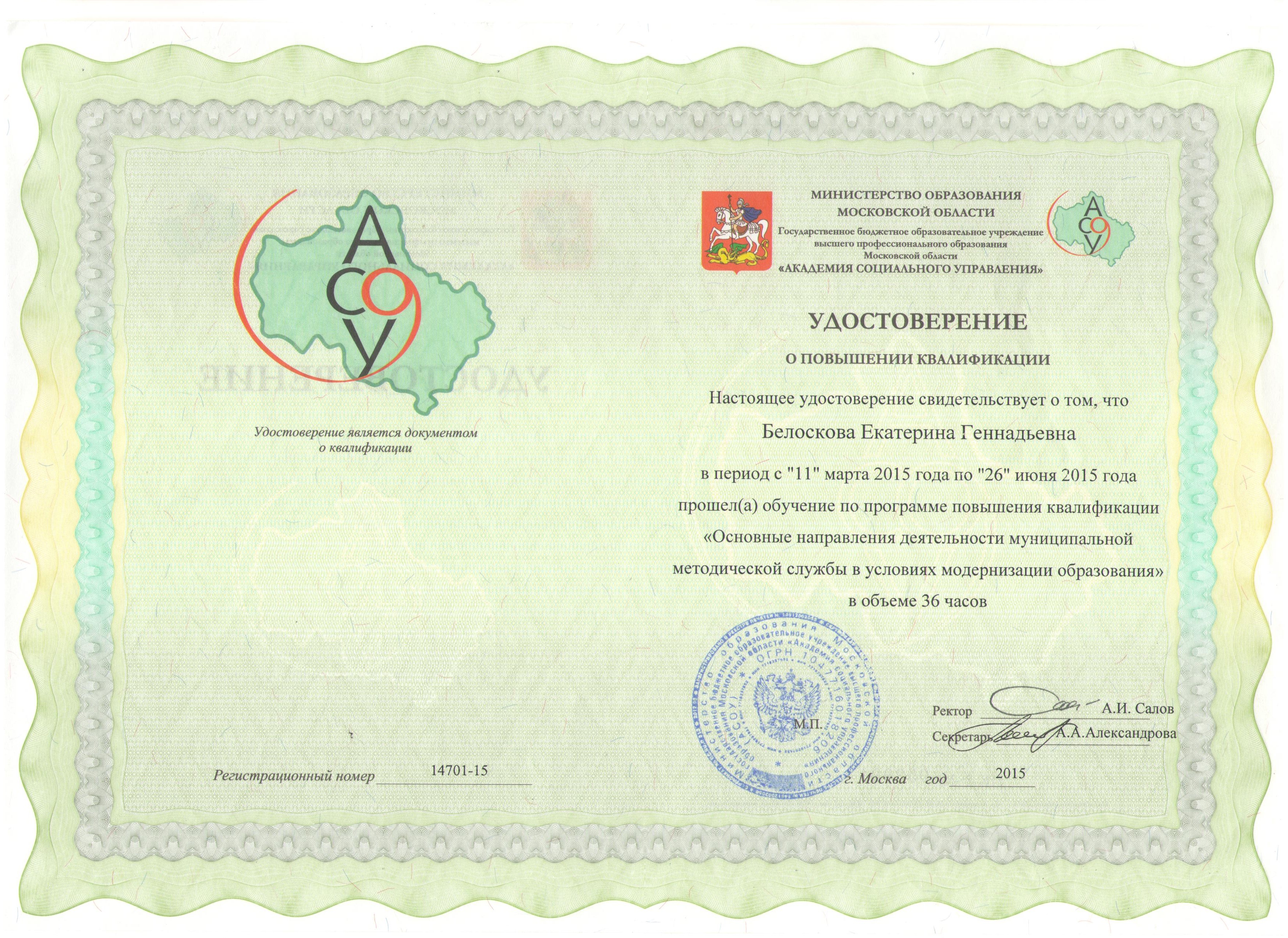Образовательная организация, выдавшая документ о повышении квалификации/профессиональной переподготовке: Государственное бюджетное образовательное учреждение высшего профессионального образования Московской области «Академия социального управления»