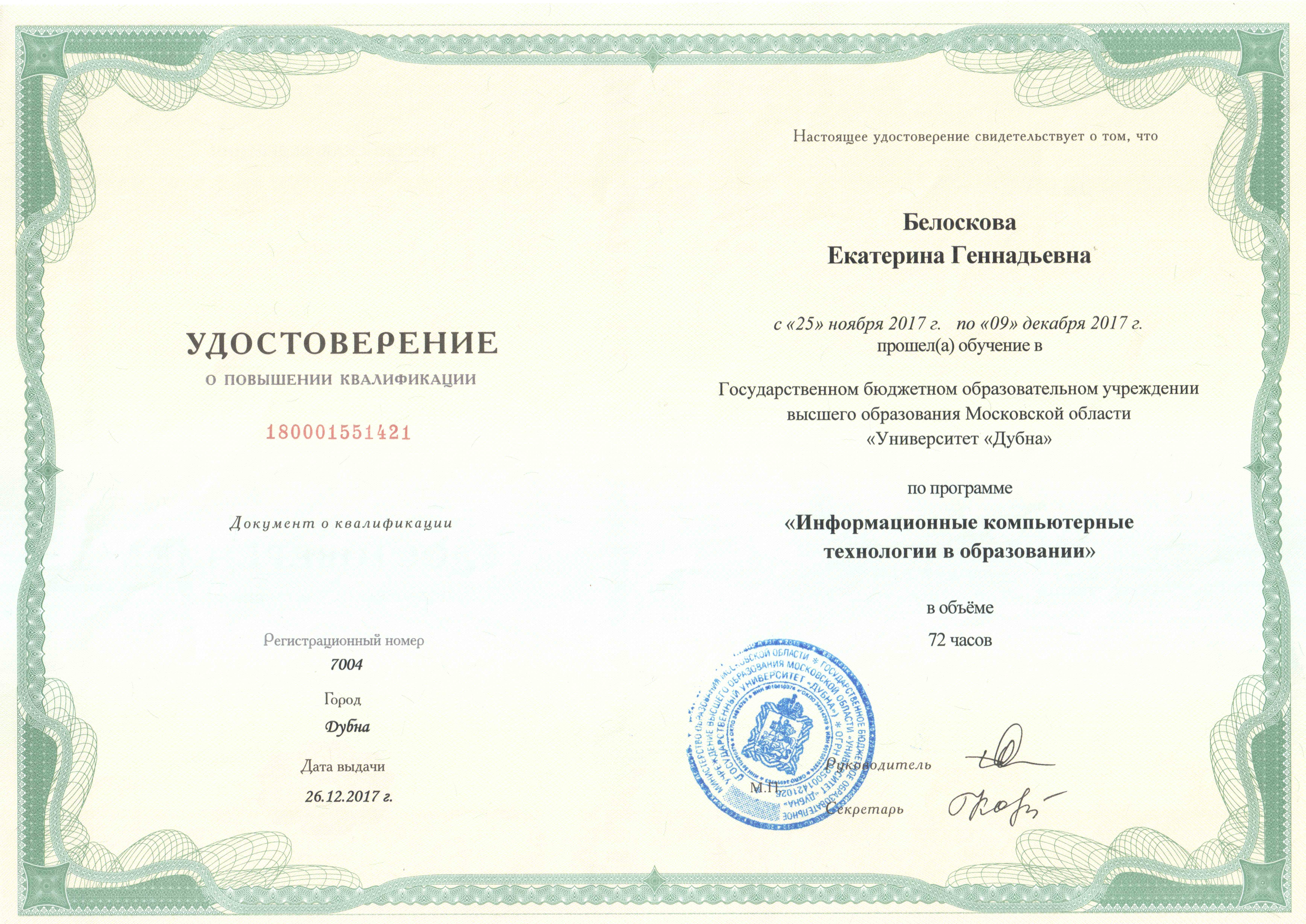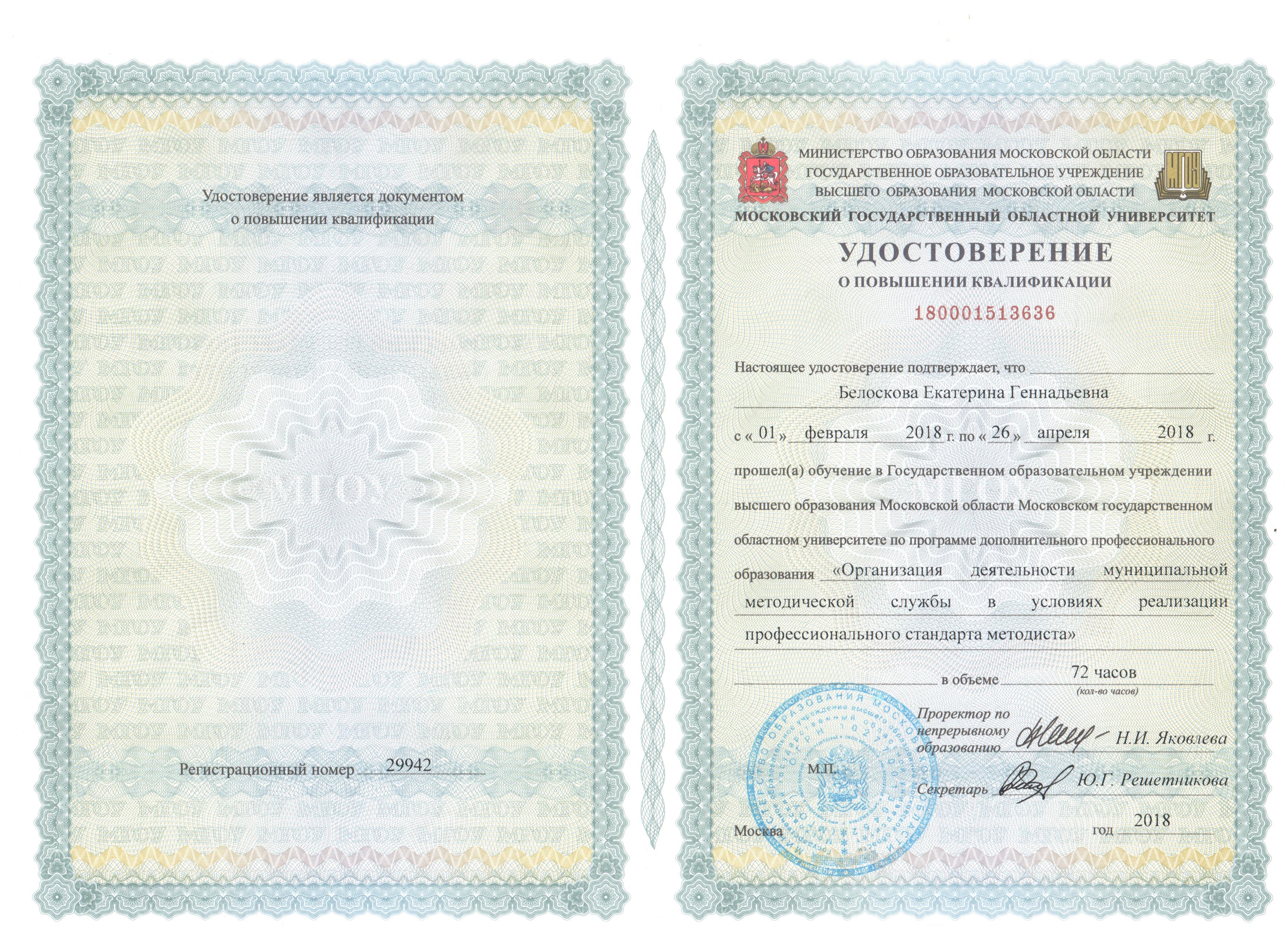 Образовательная организация, выдавшая документ о повышении квалификации/профессиональной переподготовке: Государственное образовательное учреждение высшего образования Московской области «Московский государственный областной университет»