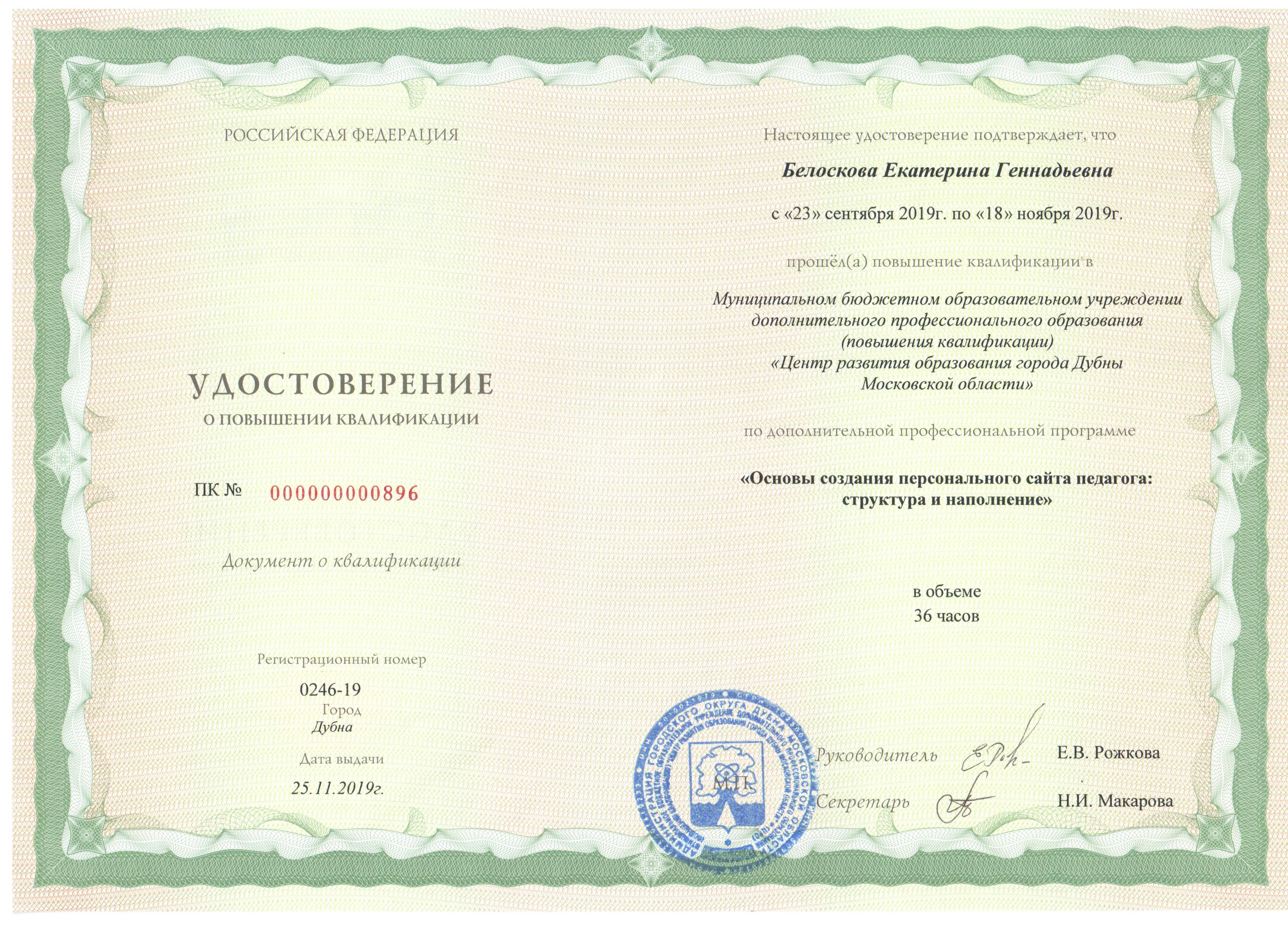 Образовательная организация, выдавшая документ о повышении квалификации/профессиональной переподготовке: Муниципальное бюджетное образовательное учреждение дополнительного профессионального образования (повышения квалификации) «Центр развития образования города Дубны Московской области»