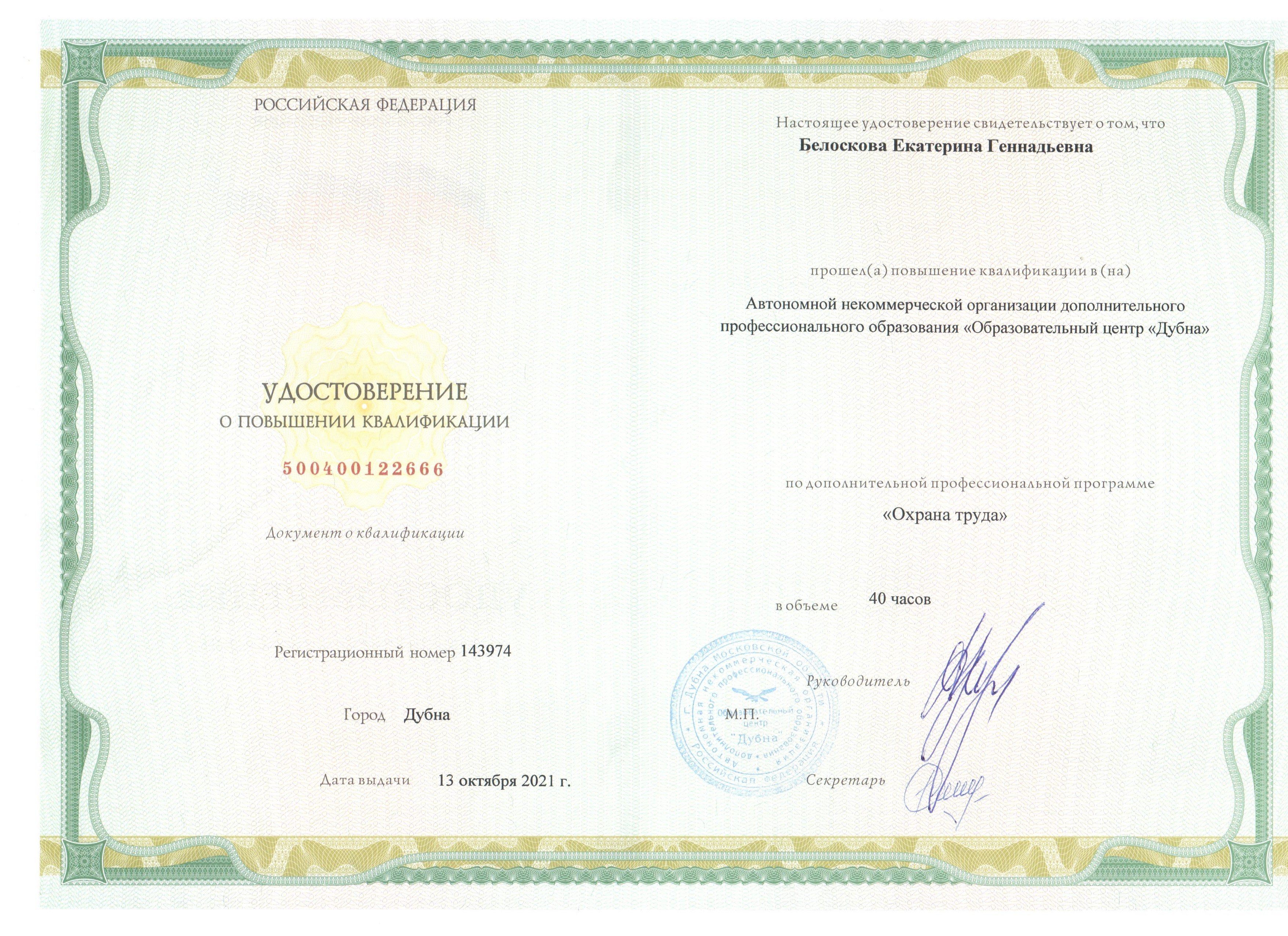Образовательная организация, выдавшая документ о повышении квалификации/профессиональной переподготовке: Автономная некоммерческая организация дополнительного профессионального образования «Образовательный центр «Дубна».