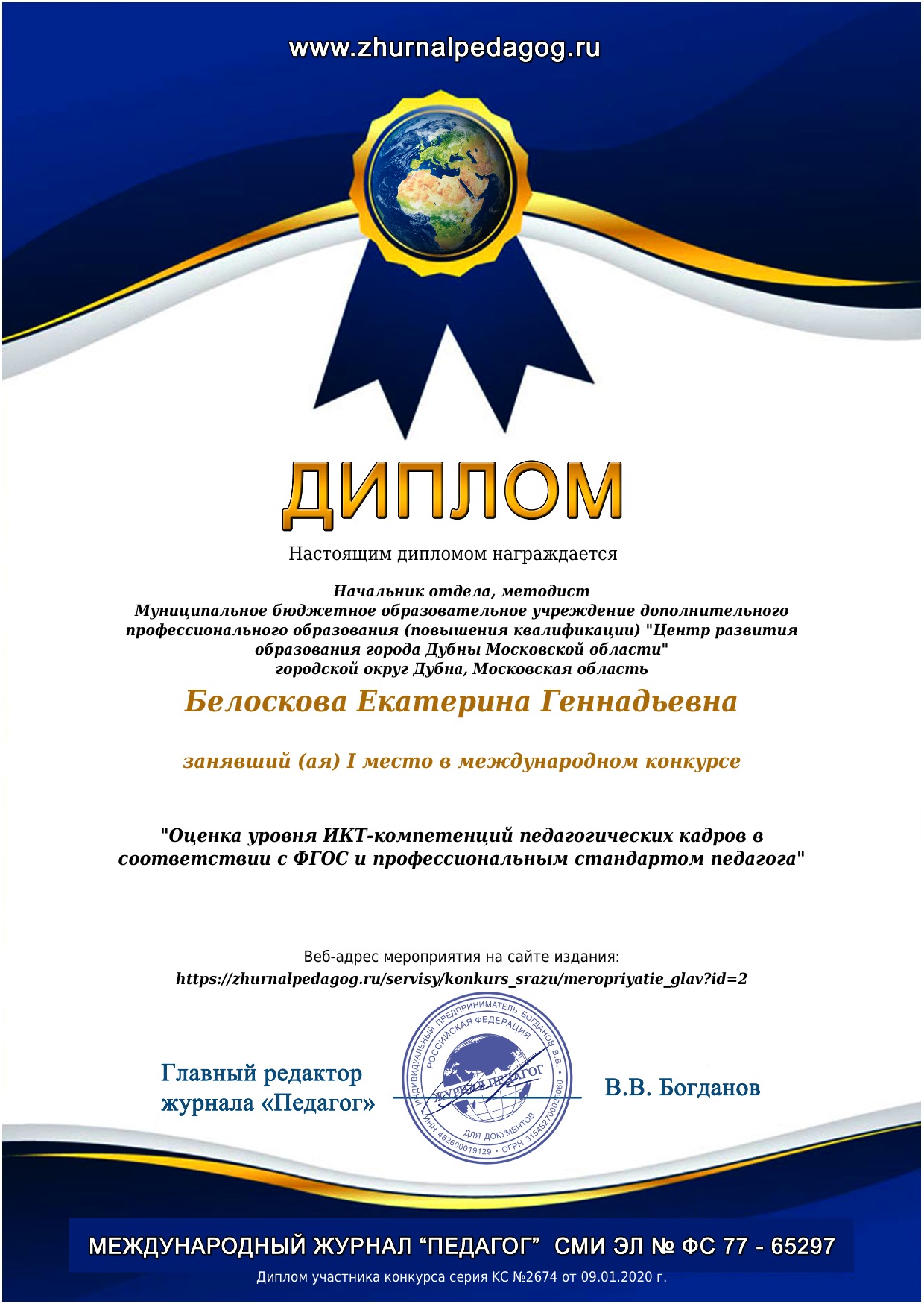 | Международный конкурс «Оценка уровня ИКТ-компетентности педагогических кадров в соответствии с требованиями ФГОС и профессиональным стандартом педагога» | международный | 2020 | Победитель, диплом I степени |