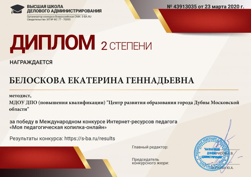 | Международный конкурс интернет-ресурсов (сайтов) педагога «Моя педагогическая копилка-онлайн» | международный | 2020 | Призер, диплом 2 степени |